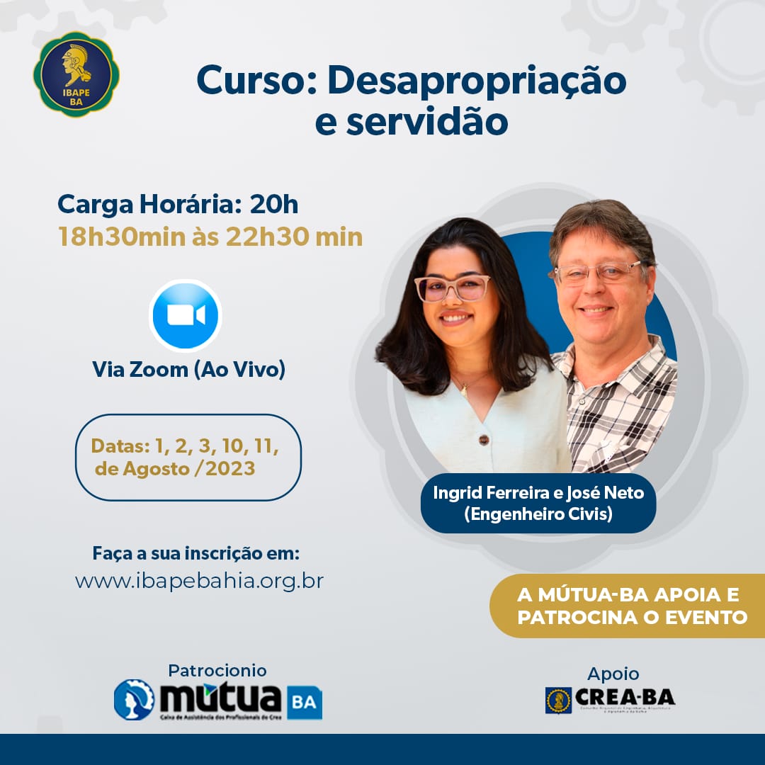 Nos Dias: 1, 2, 3, 10, 11 de Agosto de 2023 será realizado pelo Ibape-Bahia, o curso Desapropriação e Servidão, via Zoom.