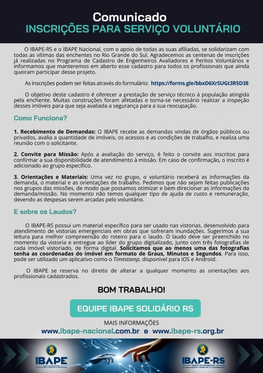 O IBAPE-RS e o IBAPE Nacional, com o apoio de todas as suas afiliadas, estão convocando engenheiros avaliadores e peritos em engenharia para se voluntariarem na reconstrução do estado Rio Grande do Sul.